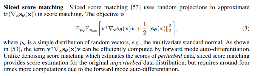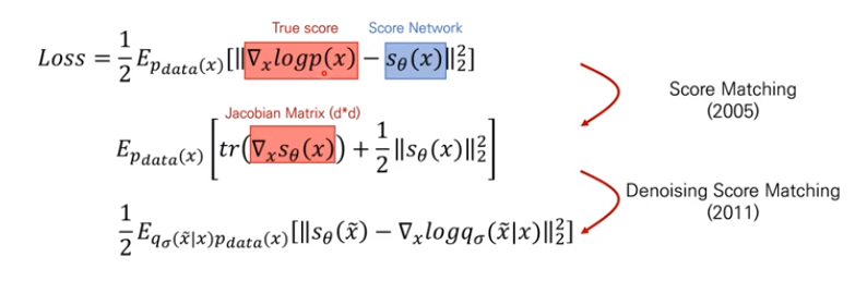 하지만 $tr(\bigtriangledown_{x}^{2}s_{\theta}(x))$를 보면(그림 식이 잘못되었음), $s_{\theta}(x)$인 score값을 2번 미분한 형태입니다. 이는 Jacobian Matrix형태이며, score network의 입력인 $x$의 차원이 $d$라면 $d * d$의 계산 복잡도를 가집니다. 그래서 차원이 증가하면 해당 loss식의 계산 복잡도는 지수적으로 증가하게 됩니다.