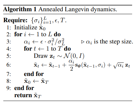 즉 $q_{\sigma_1}(x)$로부터 Langevin Dynamics를 진행하고, $q_{\sigma_2}(x)$, $q_{\sigma_3}(x)$으로 진행합니다. 그리고 한 단계에서 예측된 $\tilde{x_T}$는 다시 그 다음 단계에서의 $\tilde{x_0}$이 되어 저자들이 제안한 Annealed Lngevin dynamics를 수행하게 됩니다.