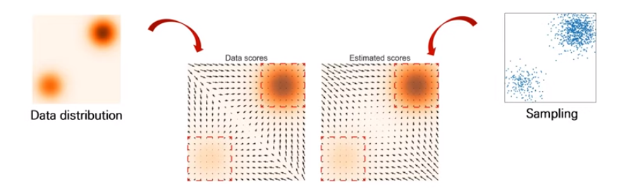 우리는 실제 데이터의 분포를 모르지만, Score의 값만 알면 데이터를 생성해낼 수 있습니다. 그 이유는 위 그림과 같습니다. Score-Based Generative Model의 과정은 위와같습니다. 먼저 실제 모집단의 데이터로부터 Score(vector field)를 추정합니다. 그 후, 추정된 Score를 바탕으로 새로운 데이터를 sampling합니다. 우리는 전자에서 Score-matching를 사용하며, 후자에서는 Langevin dynamic를 사용하게 됩니다.