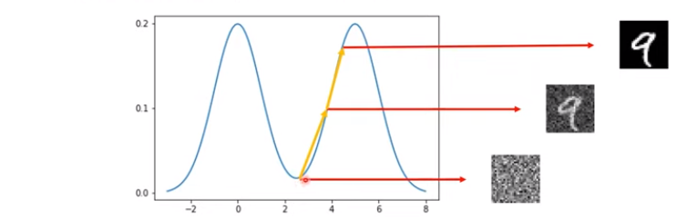 우선 Generative Model을 설명하기에 앞서, 우리는 어떤 이미지들 샘플들의 모집단을 오른쪽과 같은 확률분포로 나타낼 수 있습니다. 이는 다항 혼합 분포 형태로 되어있을것이며, 확률이 높은 곳은 그럴듯한 샘플을 말하는 것이고, 확률이 낮은 부분은 아마 샘플과 전혀 다른 아무 의미없는 노이즈를 말하는 것일겁니다.