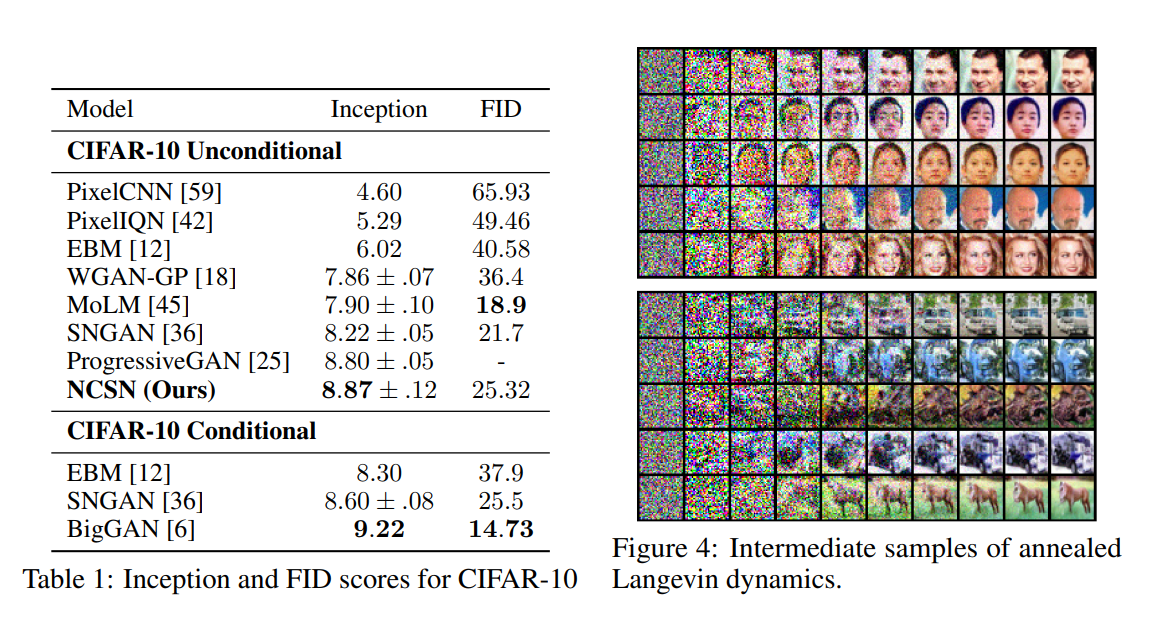 위와같이 Figure3의 (c)를 통해 Annealed Langevin dynamics sampling이 보다 정확하게 i.i.d samples과 비슷하게 sampling을 할 수 있음을 논문에서 확인할 수 있습니다.