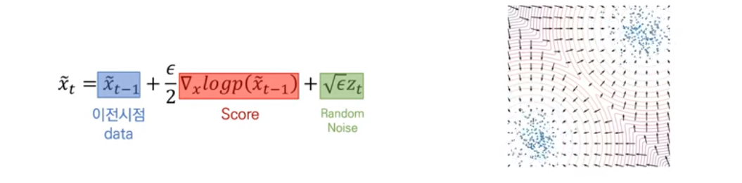 위와같이 확률밀도함수의 기울기를 계산 후 확률 값이 높아지는 방향으로 데이터를 업데이트 합니다. 이렇게 되면 확률값이 높은 곳에 도달하면 샘플링된 데이터와 유사한 데이터를 생성할 수 있게 되는 것입니다.
