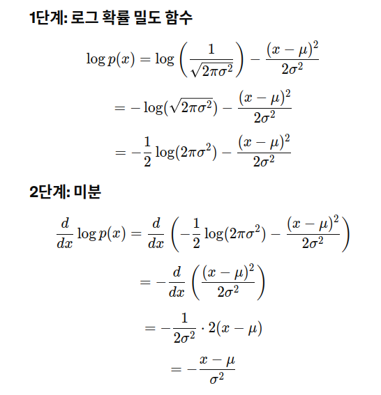 이제 Score함수에 대해 다루겠습니다. Score란 확률밀도함수의 미분을 말합니다. 즉, 입력 데이터 x에 대한 미분이라고 할 수 있습니다.