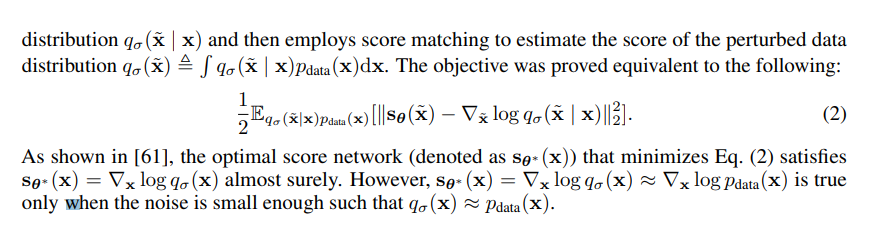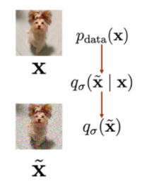 denoising score matching에서 $q(\tilde{x}|x)$는 데이터 $x$에 조건화된 노이즈가 추가된 데이터 $\tilde{x}$의 조건부 확률 분포를 나타냅니다. 이의 목적은 $\tilde{x}$에 대해 가능한 한 정확하게 원래 데이터 $x$의 위치를 추정하는 것입니다. 여기서 노이즈가 충분히 작으면 원래 데이터의 score를 예측할 수 있습니다. 이를 설명한 것이 위의 맨 마지막 수식에 나타나있습니다. 노이즈가 충분히 작다면, $s_{\theta^*}(x) = \bigtriangledown_{x}log_{q_{\sigma}}(x)$가 성립하고, 이가 $\bigtriangledown_{x}log{p_{data}}$와 근사된다고 논문에서 설명하고 있습니다.