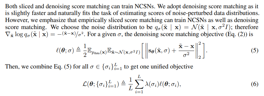 Loss function의 형태도 조금 바뀝니다. $s_{\theta}(\tilde{x})$가 이제 노이즈가 추가되었기 때문에, $s_{\theta}(\tilde{x}, \sigma)$가 됩니다. 위 그림의 목적함수가 잘못되어서 아래의 논문에서 가져온 목적함수를 보겠습니다.