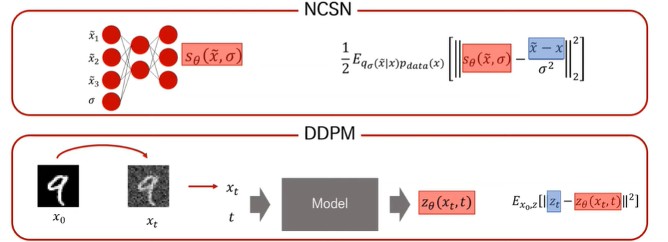 이제는 해당 논문(Score-Based Generative Modeling Through SDE, ICLR 2021, Song. et.al.,)을 볼 시간입니다. 생각해보면, NCSN과 DDPM의 훈련과정은 어느정도 유사하고 목적함수도 비슷한 것을 생각해볼 수 있습니다. 둘 다 노이즈가 추가된 데이터를 받아서 출력값을 내게됩니다. 그리고 모델의 출력값과 랜덤 노이즈를 맞추어 나가는 식으로 학습이 됩니다. --> Score-Matching으로서 동일하지 않을까?