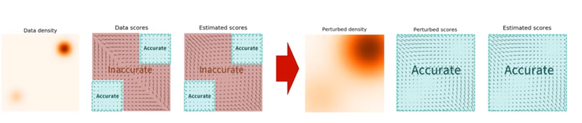 그래서 논문의 저자들은 데이터에 노이즈를 추가한 후 Score값을 추정하자고 합니다. 노이즈가 추가된 데이터가 확률값이 낮은 공간을 채워서 Score의 추정을 가능하게 하기 때문입니다.