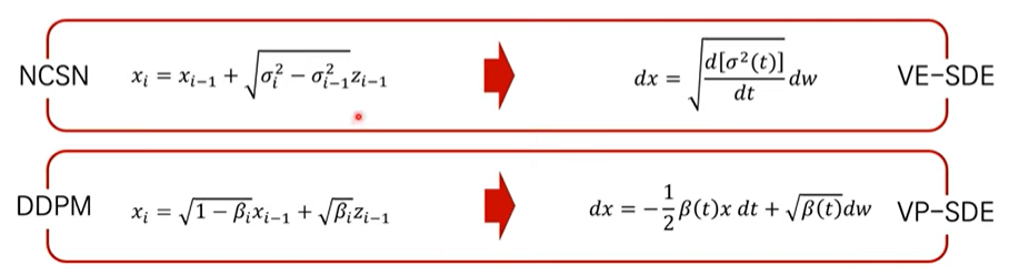 NCSN의 VE-SDE는 결국에 $t \rightarrow \inf$일 때, variance가 exploding합니다. 하지만 DDPM의 VP-SDE은 variance를 preserve한다는 특징이 있습니다.