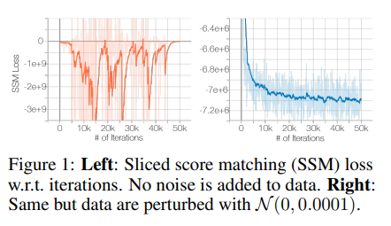 실제 논문에서는, Figure1과 같이 Sliced score matching(SSM)을 ResNet을 사용해서 훈련시킬 때, SSM Loss가 처음에는 줄어들지만 그 이후로는 불규칙하게 진동합니다. 이에 반해 가우시안 노이즈를 추가한 perturb data를 통해 학습을 하면 SSM Loss가 수렴하는 것을 볼 수 있습니다 (이것이 아래에서 볼 해결방안이 됨).