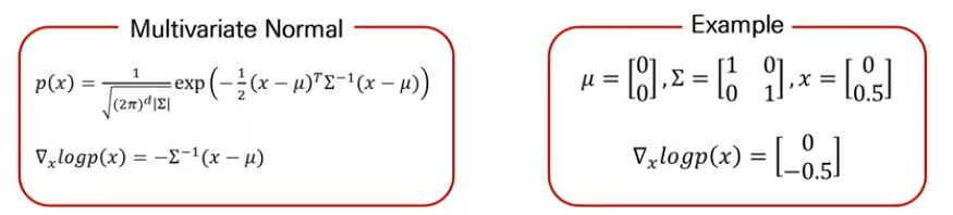 위는 Multivariate Normal Distribution의 예시를 든 것입니다. $p(x)$를 x에 대해 미분한 값을 볼 수 있고, 이를 실제 평균 벡터, 공분산 행렬에 대해 직접 계산한 값을 오른쪽에서 볼 수 있습니다.