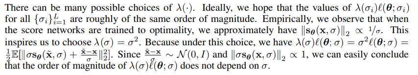 각 단계의 noise scale이 다르다면, 각 단계마다의 목적 함수도 다를 것입니다. 그래서 각 단계마다 적절한 weight를 가해서 objective를 더해줄 필요가 있는데, 그렇기 때문에 우리가 위에서 $\lambda(\sigma_i) > 0$인 coefficient function을 통해 목적 함수를 통합했던 것입니다.