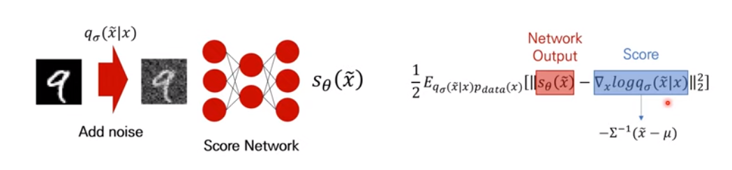 Score Network의 입력값은 실제 샘플 이미지에 노이즈를 씌운 $\tilde{x}$가 됩니다. 그리고 출력값은 해당 데이터의 Score가 될 것입니다. 우리는 해당 과정을 모델링하기 위해 위와같이 Loss식을 세운 것이니까요.