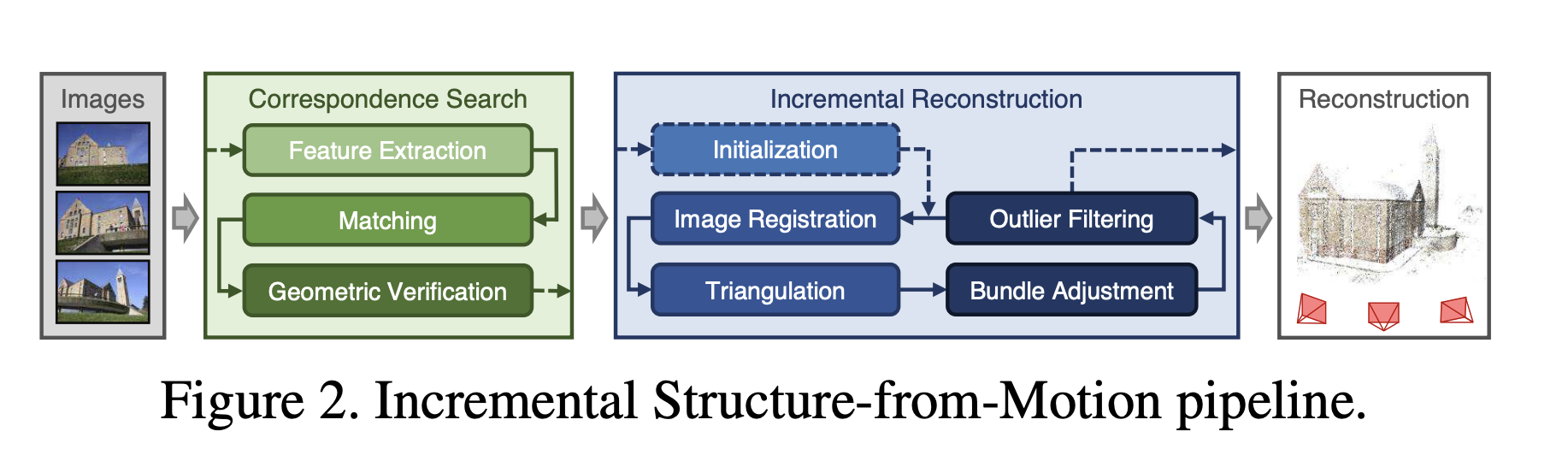 unordered input image가 들어오면 SIFT같은 알고리즘으로 Feature를 만듭니다. 그리고 Feature Matching을 해주고 Epipolar geometry를 통해 Feature를 correspondence시킵니다. 그 후, Initialization에서 이미지 1쌍을 구하고 Image Registration에서 Fundamental Matrix --> Essential matrix --> R, T를 분해합니다. 이러한 방향정보를 저장하고, 이 정보를 활용해 Triangulation을 해주어 3D point를 구합니다. 그리고 Bundle Adjustment와 outlier filtering으로 에러를 줄이고 이러한 일련의 과정을 이미지가 들어올때마다 반복하여 camera pose와 3d point를 반복적으로 수정합니다.