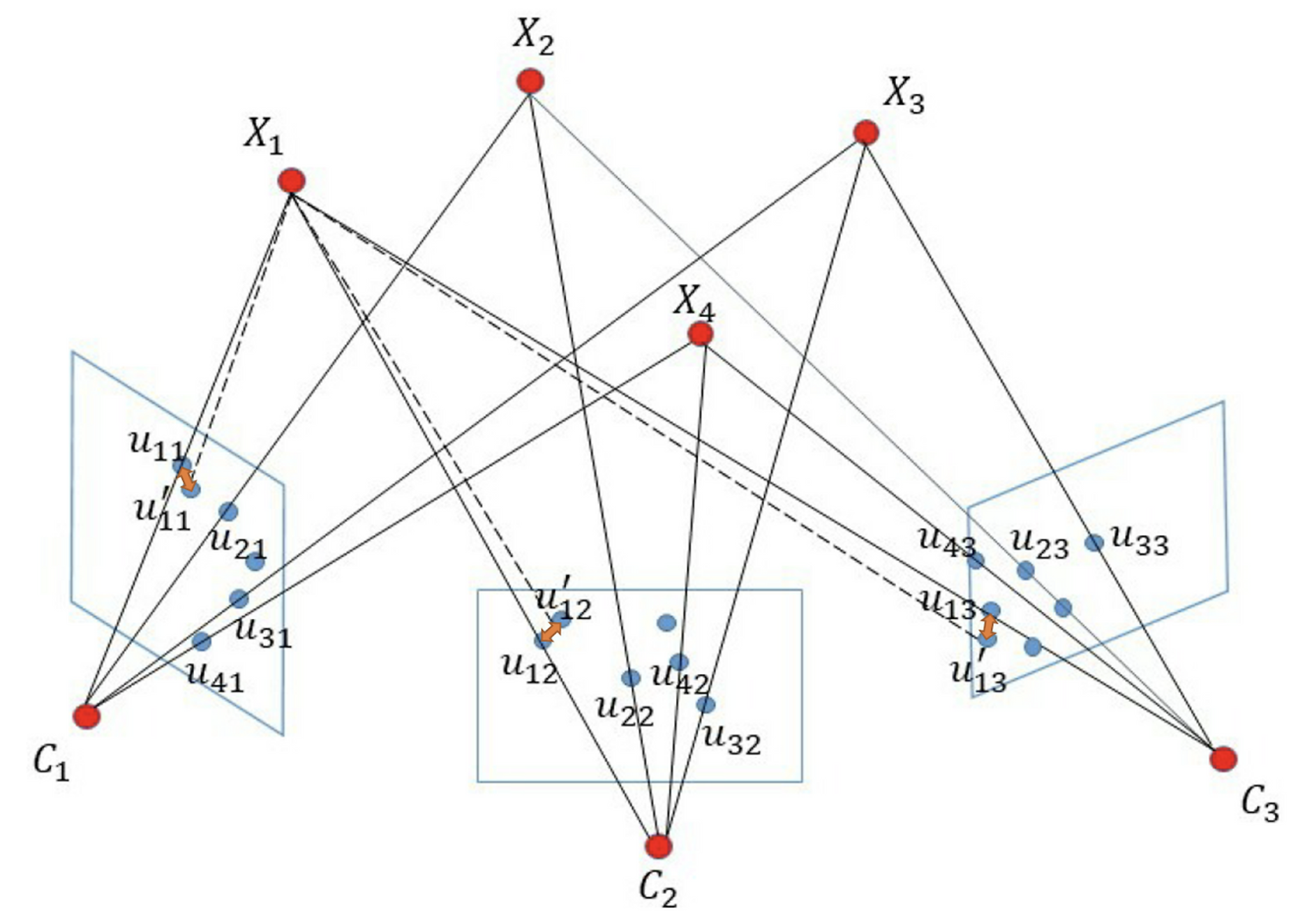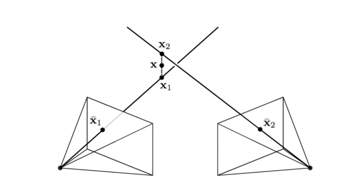 Triangulation(삼각측량)은 두 개 이상의 이미지에서 매칭된 특징점을 이용해 3D 점을 추정하는 것입니다. 이렇게 구한 3D 포인트들은 SfM의 3D Point Cloud를 구성하는 데이터가 됩니다. 이는 이전에 등록된 3d points를 새로운 이미지로 projection하면 잘 관측된다는 전제하에 이루어집니다.