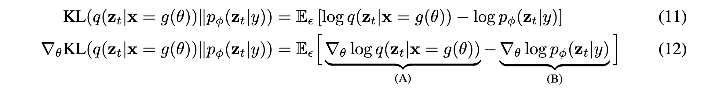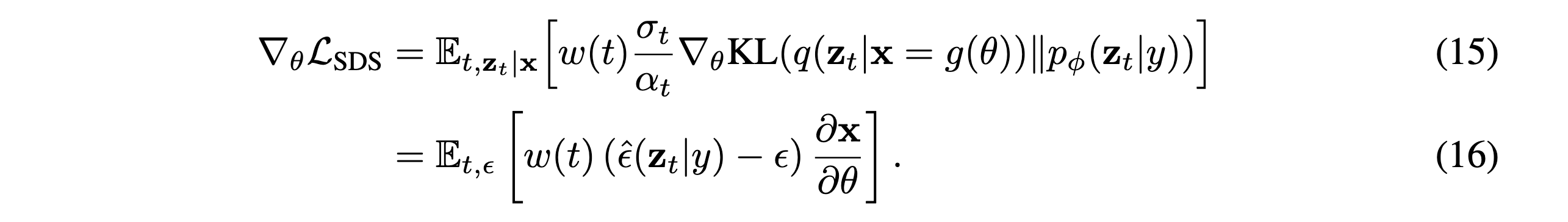 NeRF로 rendering한 이미지 \(x\)가 있고, latent variable \(z_t\)를 만드는 확률분포 \(q\)와 텍스트로 임베딩된 \(y\)가 주어질때 U-net의 파라미터에 따라 다른 확률분포를 만드는 \(p_{\phi}\)간의 KL-Divergence를 최소화하기 위해 위 식을 구성합니다[weighted density distillation(2018)]. 그리고 \(\epsilon\)으로 샘플링한 기댓값으로 나타내고, Gradient를 취하면 (A), (B)와 같은 항으로 구성되게 됩니다. 먼저 (A)의 \(z_t\)는 \(\theta\)에 대해 고정된 값이 만들어지기 때문에 미분값이 0입니다.