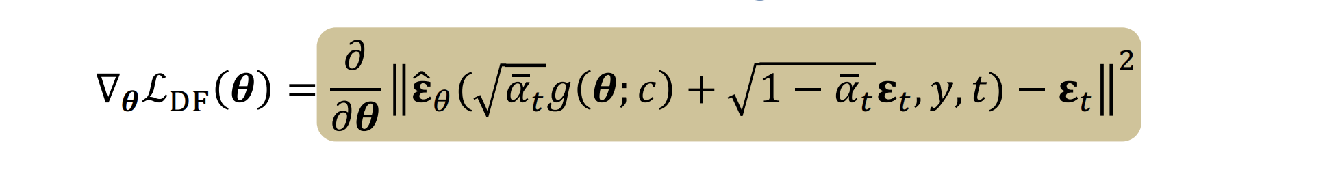 DreamFusion의 오른쪽 부분이 SDS부분입니다. DreamFusion에서 입력은 NeRF로 생성된 이미지입니다. 위 수식에서와 같이 \(g(\theta ; c)\) 특정 angle에서 샘플링된 이미지라고 할 수 있습니다. 이는 DDPM에서의 \(x_0\)이라고 할 수 있습니다.