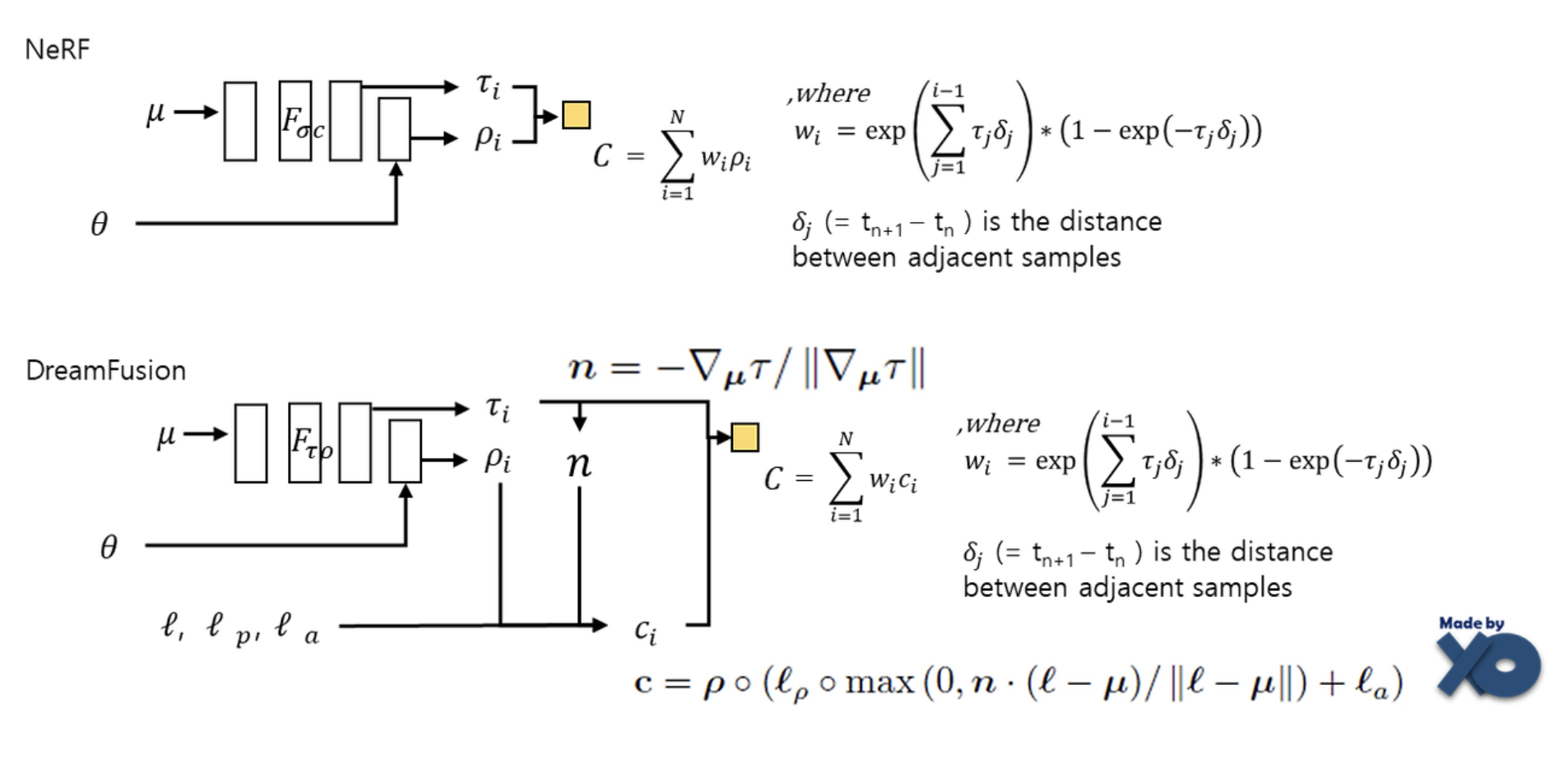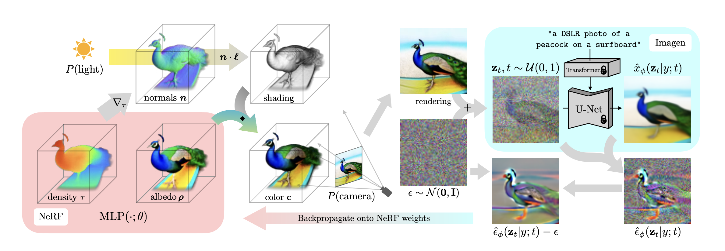 NeRF는 Ray의 방향에의해 결정되는 radiance color \(\rho\)을 volume rendering하여 color pixel값을 결정했습니다. DreamFusion은 위 방식에 추가조명을 활용하여 조명에 따라 달리 보이는 surface color c을 활용하여 volume rendering합니다.