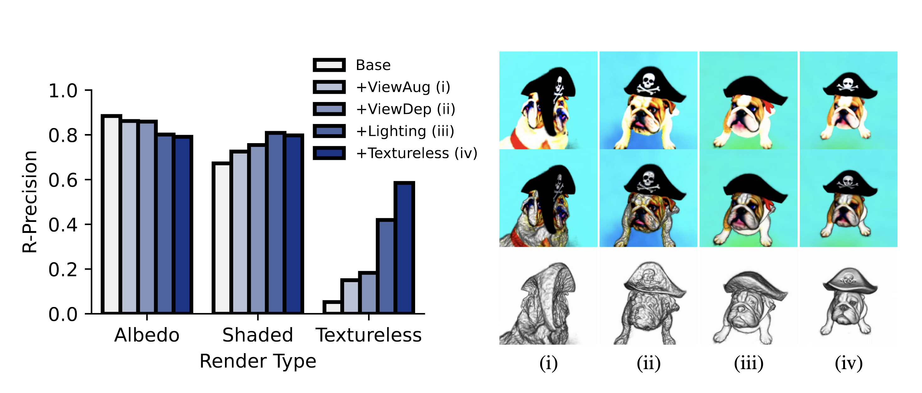 추가로 albedo \(\rho\)를 white color (1, 1, 1)로 바꿔주면, texture가 없는 shaded output을 만들 수 있습니다. 이렇게 shaded x albedo를 통해 color를 결정하면 물체의 외형 정보와 조명 효과가 분리되어 모델링됩니다. 즉 이를 통해 성능을 높일 수 있었다고 합니다.