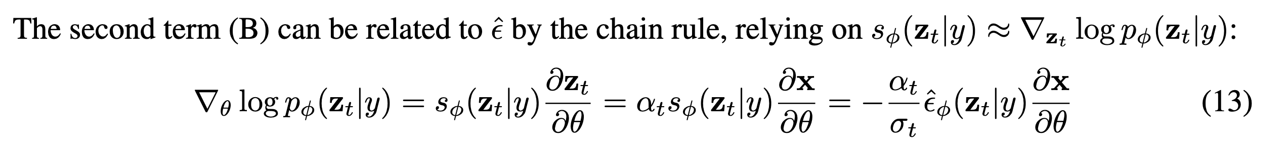 (B) term은 score function을 chain rule로 분해하여 위와같이 나타냅니다. NeRF parameter \(\theta\)에 대해 결정되니까 score function의 정의에서 chain rule로 분해해 주어야 합니다.