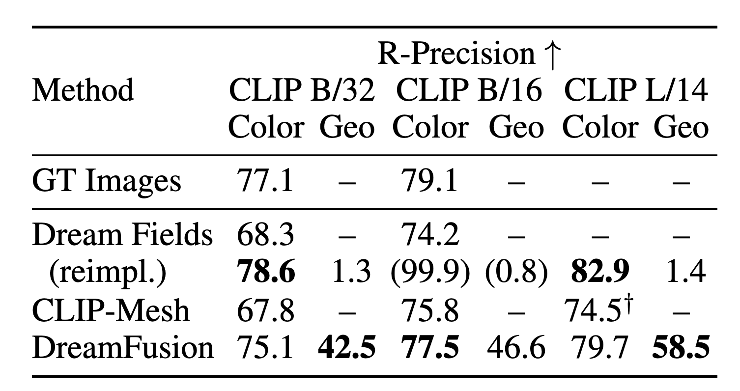 3D reconstruction task는 일반적으로 recovered geometry와 GT간의 Chamfer Distance를 계산하여 평가하고, view-synthesis는 rendered된 veiw와 GT를 비교하는데 PSNR를 씁니다. 하지만 이에 대한 zero-shot에 대해서는 GT가 없기 떄문에, 입력 문장에 대한 렌더링된 이미지의 일관성을 측정하는 CLIP R-Precision으로 평가합니다. R-Precision은 렌더링된 이미지가 주어질때 CLIP이 오답 텍스트중에 정답을 적절히 찾는 정확도로 계산됩니다. 이에 대한 다양한 zero-shot text-to-3D모델과의 비교 결과입니다.