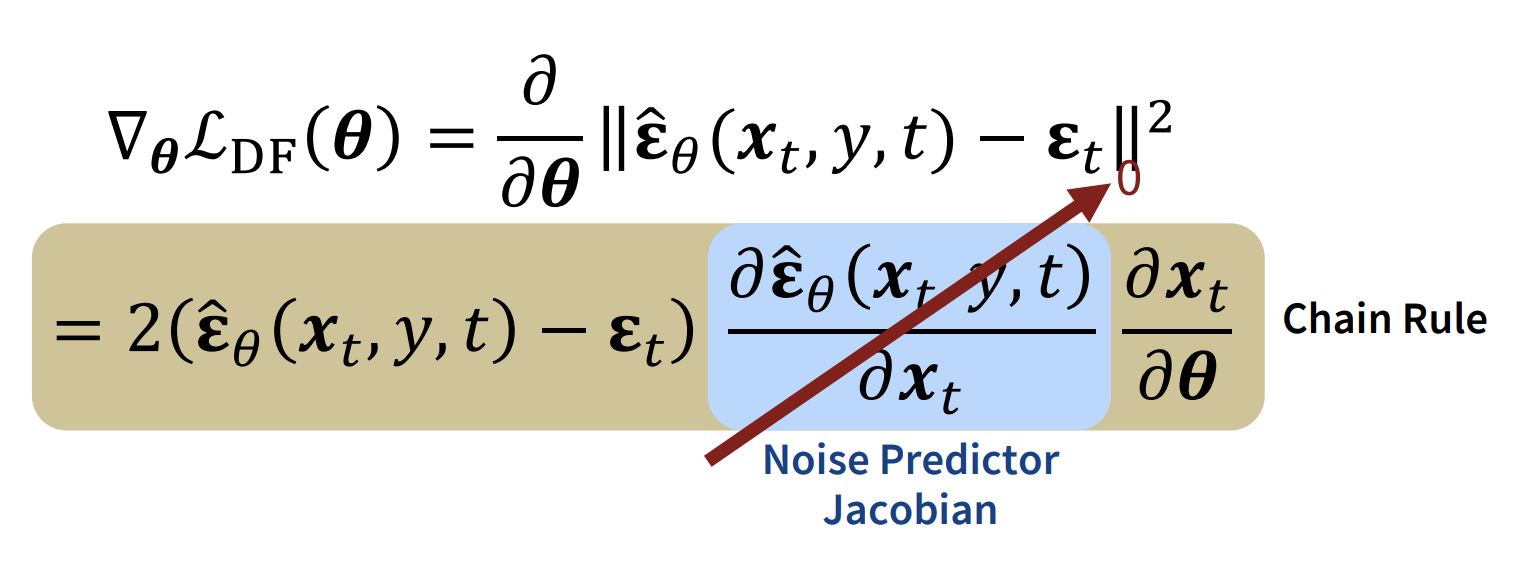 \(\nabla_{\theta}\mathcal{L}_{DF}(\theta)\)을 chain rule을 이용해 분해하면 Noise Predictor Jacobian이 중간에 있게됩니다. \(\hat{\epsilon}_{\theta}\)는 parameter가 많은 모델이기 때문에, 이를 계산하기 위해서는 memory가 매우 많이 필요합니다. 저자들은 간단히 해당 term을 0으로 만들어도 SDS가 잘 동작한다는 것을 발견해서 실제로 omit했다고 합니다. 위 그림에서 U-net이 lock되어있는 이유도 이에 해당합니다.